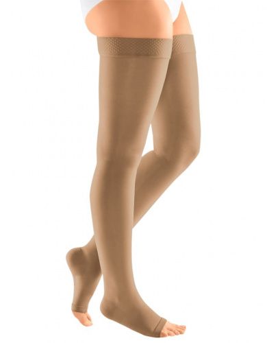 Компрессионные чулки 1-ого класса компрессии mediven plus с открытым носком и силиконовой резинкой на широкое бедро как универсальное решение в лечении заболеваний вен.
