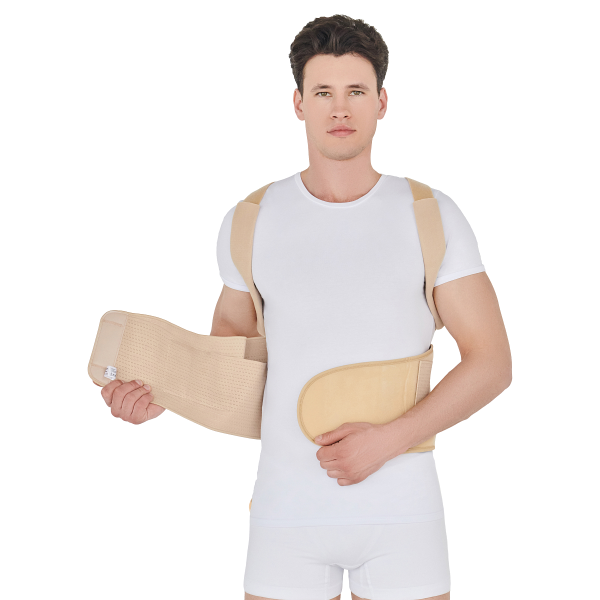 - корректор для осанки спины усиленный, его особенностью является наличие эластичного пояса, дополнительно обеспечивающего уравновешивание тонуса мышц, участвующих в удержании положения тела. Наличие пояса позволяет дополнительно фиксировать и разгружать поясничный отдел позвоночника при наличии болей;